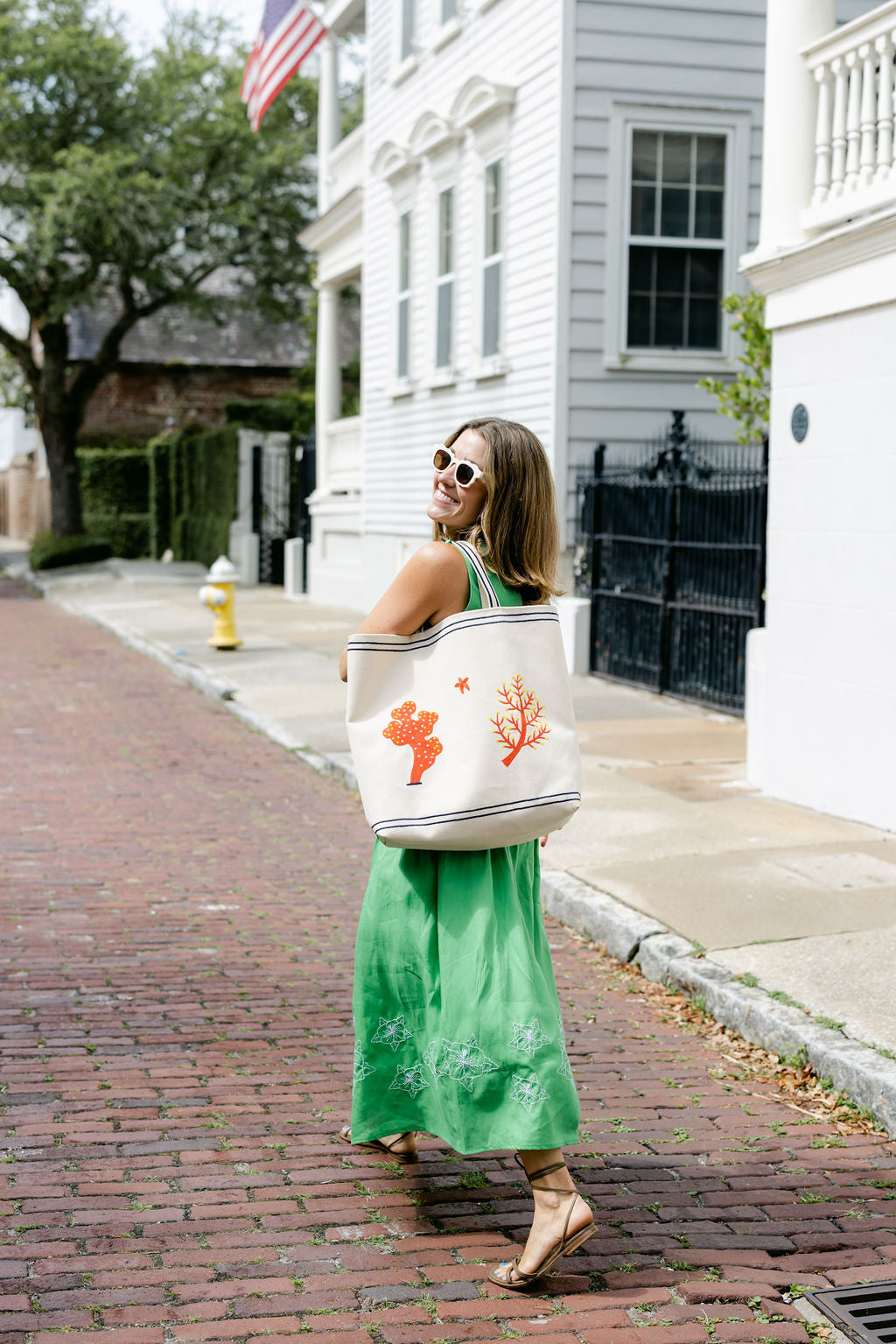 Created in collaboration with Liz Adams, this cotton midi dress features a timeless silhouette that flatters with a round neckline and sleeveless design. The skirt cascades in a flowy drape, accented by delicate white rose embroidery that adds a touch of whimsy.